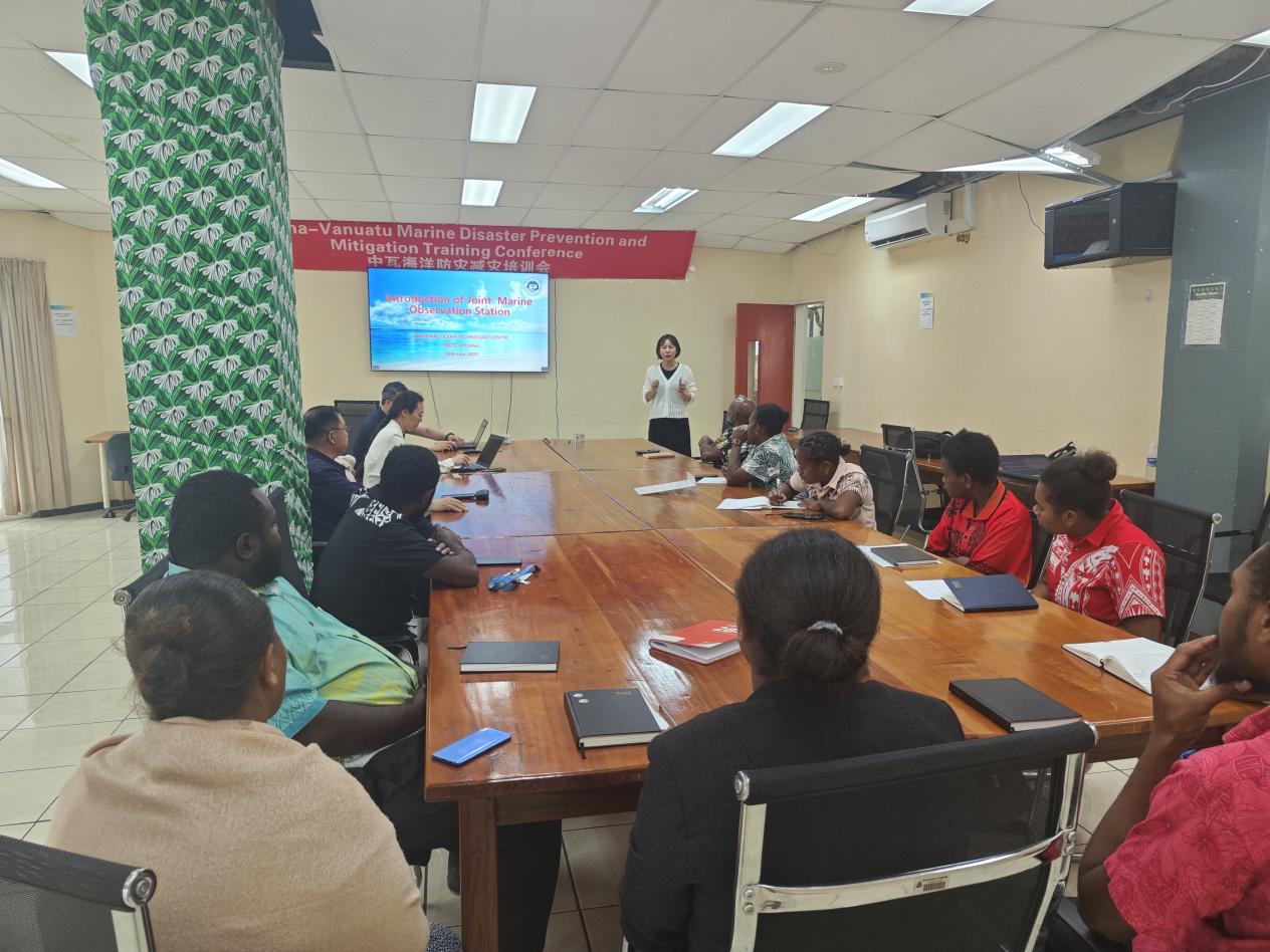7月23日,在瓦努阿图气象与地质灾害局会议室,王芳主持本次培训会,现场20多位技术人员参加。首先由张翼飞正高级工程师系统介绍了海洋观测站的作用及瓦努阿图海洋观测技术的建议;中环天仪宫帅工程师介绍了观测站各个集成设备和传感器的使用方法和维护注意事项;国家海洋环境预报中心付翔研究员介绍了中国风暴潮和海啸早期预警的技术路径和经验做法。报告结束时,瓦努阿图气象与地质灾害局的年轻工程师esther展示笔记本——页角贴满标签,写满中文注音的技术术语,她十分关注数据接收情况及设备的维护,希望后期将新建设的观测站数据共享在unesco 海洋观测共享数据库中,作为瓦努阿图第三个共享站。