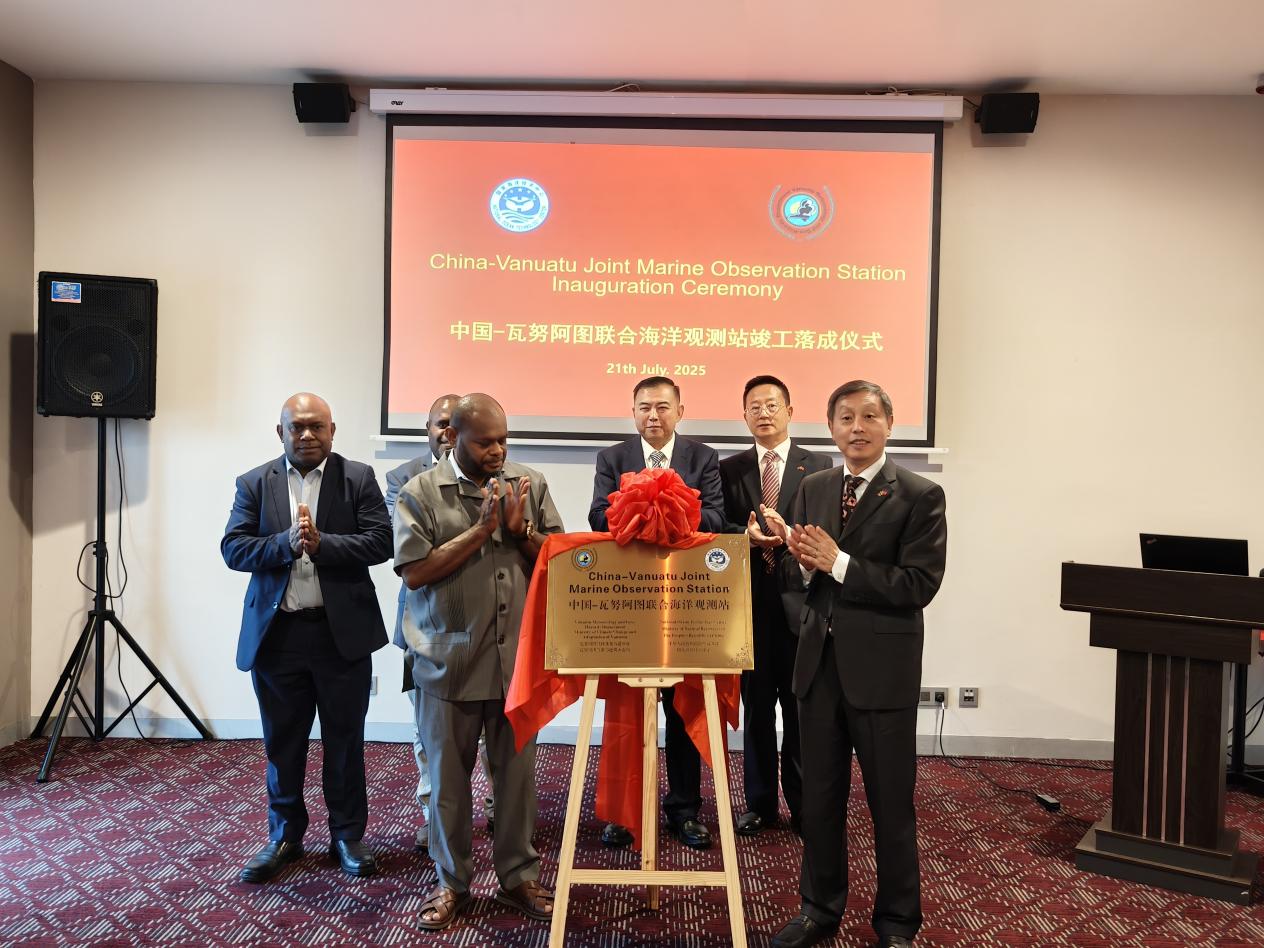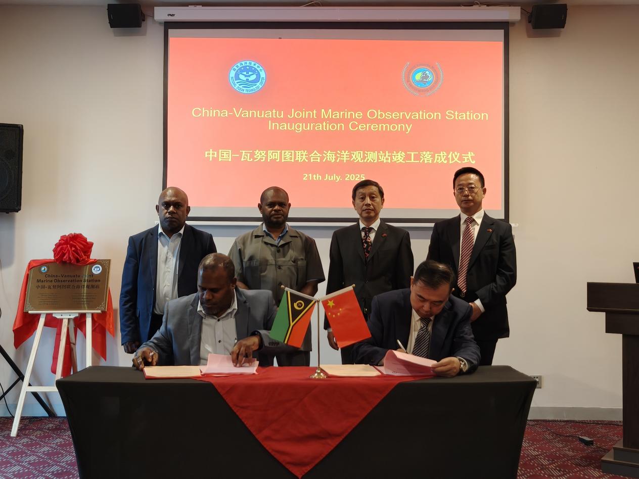现场由李名刚大使及卡尔米特部长代表两国政府为中瓦海洋联合观测站揭牌。在李名刚大使、卡尔米特部长、吉布森总司长及陈宗伟商务参赞的见证下,国家海洋技术中心隋军副主任与瓦努阿图气象与地质灾害局levu局长签署《国家海洋技术中心与瓦努阿图气象与地质灾害局关于海洋领域合作备忘录》。
