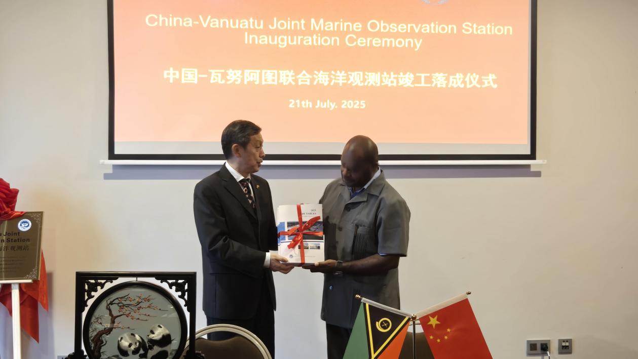 李名刚大使代表中国政府向瓦方赠送《2025—2026年潮汐表》及中国手工艺产品,并在致辞中回顾中瓦在海洋与气候变化领域的合作历程,强调将以两国领导人达成的重要共识为战略引领,落实第三次中国—太平洋岛国外长会议成果,深化全天候、全方位友好合作,携手构建新时代中瓦命运共同体。
